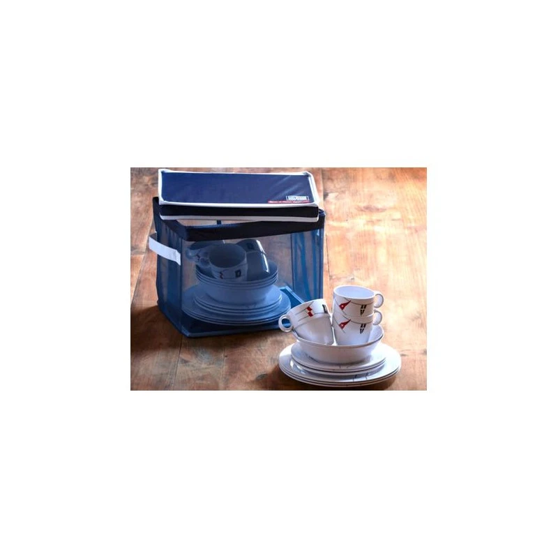 Le set vaisselle incassable REGATTA de chez Marine Business est composé de 25 pièces en mélamine. Il contient : 6 assiettes plates, 6 assiettes creuses et 6 assiettes à dessert, 6 mugs et un panier en tissu. Toutes les pièces sont fabriquées en mélamine incassable, sont empilables et antidérapantes. Le tout peut être rangé dans le panier multi-usage avec couvercle en PVC bleu marine. Il peut égalmenet servir à ranger la vaisselle, des cables, des chaussures ou tout autre accessoire nautique. Les dimensions du set sont : 34,5 x 25,5 cm, hauteur : 26 cm.
